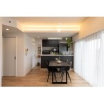 付けI型キッチンキッチンから対面型キッチンへと変更し、調理中も家族の様子がよく見えるキッチンへ。 マンションでキッチンの向きを変えるので、床上げをする必要がありましたが、一段上がることで少し高い位置からお子様の様子を見ることも可能にしました。 間取り変更で、以前よりリビングの面積を広くしよりくつろげる空間へと変貌しました。 ダイニングとキッチンの間の梁を利用し、ダイニングの天井を下がり天井へ変え、間接照明を設置することでやわらかい光がダイニングの雰囲気をよりやわらかくします。