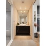 洗面所の間取りはそのままに、洗面台をご主人様ひとめぼれのTOTOのエスクアを採用。 天井までの大きな三面鏡は残したまま、下の洗面台とキャビネットを交換して、お悩みの解決と希望の空間への変身を実現しました。 洗面ボウルは、陶器の持つ落ち着いた質感とシンプルな形状が印象的なカウンターに据え置くタイプものを、キャビネットは床から浮いたような空間に広がりを持たせるデザインで、静かに閉まるサイレンのレール仕様のものを採用。 毎日の生活で使う場所だからこそ、上質で癒しを感じれる空間となっています。 開き扉で収納力が少なく、タオルなどの細かいものが収納しづらいなどのお悩みを、引き出し型の収納に変えることで、収納力と使いやすさを実現しました。 キッチンからだけでなくリビングからもアクセスできる仕様で生活動線の良さを実現。