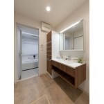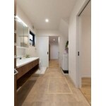 ダイニングともつながった洗面は、廊下・洗面・ダイニングと回遊性に優れて、日々の暮らしをスムーズにして家事も楽になりました。日常生活や家事が楽になる動線や工夫がいっぱいの洗面。 2世帯で暮らすため、共有スペースの水まわりはゆとりを持った空間に。洗面台だけの洗面から、洗濯などもできるように、洗面台の位置を変え、階段下に洗濯機スペースにすることで、狭さを感じずに空間を有効活用。 背の高い収納とフロートタイプの収納で、収納力をしっかり確保。フロートタイプの化粧台と上吊り引き戸で、日々のお掃除も楽で清潔に。