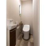 親世帯がメインで使う2世帯住宅のトイレは、淡い色と落ち着いたブラウンでシックな雰囲気を仕上げた、大人のおしゃれな空間に。 タンクレストイレで空間にゆとりができ、淡いブラウンのクロスや割肌感がリアルな石調クッションフロアが、上品に彩ります。 玄関の拡張に伴い位置と向きを変えたトイレは、出入りもお手入れも楽になりました。 手洗いをカウンターに設けることで、小さなお子様からお年を召した方まで手を洗いやすく、お客様が来られた時にも小さなお荷物なら置けて便利。洗面下の収納にはストックや掃除用具も入れられて室内がすっきりします。
