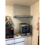 コンロ上のレンジフードは自動洗浄機能のあるお手入れのしやすいものに。 オーブンの上にはコンロで使用していたレンジフードを取り付けました。 こちらは新しく取り付けたため、屋外への排気口がなく電気工事も含め作業いたしました。