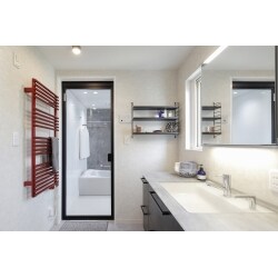 洗面所にある赤のアクセントはリラインスのタオルウォーマーです。 スマートな暖房機をご所望で提案させていただきました。タオルウォーマーも輻射熱によって暖かくなるので暖房効果もあります。元々、床置きタイプの暖房を置いていましたが壁タイプで納まりもよく洗面所のアクセントにもなりました。