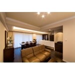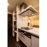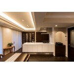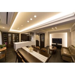 キッチンからお部屋全体を一望できるようになりました。フローリングや後ろの収納棚の黒と、フルフラットなキッチンの白のコントラストが効き、天井のコーブ照明も手伝い、生活感を感じさせないエレガントな空間となっています。