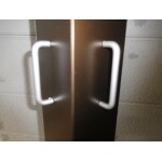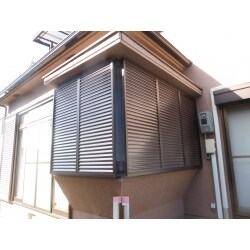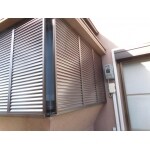 ガラスのコーナー雨戸には、既製品では無く、作るしかなく、考えた結果、上下にレールを作り、手動ではありますが、角を中心として、新設したアルミ製の雨戸のレールに入れていき、角部分にコーナー部材を取り付け、落とし錠を取り付け、台風対策の雨戸としました。