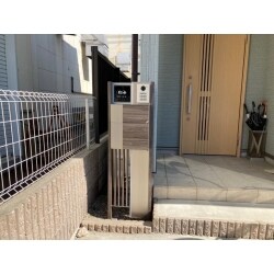 玄関の木目にあわせて木目調のポスト付き門柱と表札、新しくインターホンの交換を提案しました。 玄関のテイストにあったモダンな雰囲気で、お家を美しくみせてくれます。