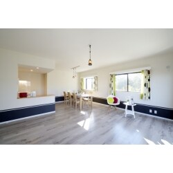 全体的に明るくなるように、クロスは白に、フローリングはPanasonicのウッディ・アーキ。キッチン前の子壁にはアクセントクロスを貼り、まるで別世界のリビングをご提案いたしました。