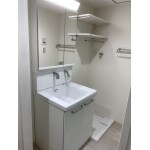 シンプルでお手入れしやすいTOTOのサクアをご提案しました。元は見える収納でしたが、鏡裏の収納なのでたっぷり入り見た目はスッキリです。 洗面化粧台交換に併せて収納スペースを増やしたいとのご要望をいただき、壁に南海プライウッドのランドリー可動棚を取り付けました。