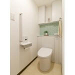 シンプルな設備とブルーの壁紙で清潔のあるトイレ空間に。
