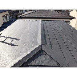 工事後、見違えるように綺麗になりました。 もちろん屋根の耐久性も向上しております。 スーパーガルテクトはスレート屋根材と比べ、割れに強く、カビ・コケも繁殖しない為、綺麗な美観を維持できます。