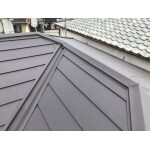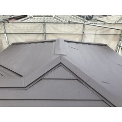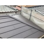 現状の屋根破損をしっかりと修繕する事・今後の災害に耐えれる屋根に仕上げる、という2点を考慮し、スーパーガルテクトへの屋根葺き替え工事をご提案させて頂きました。 左右及び裏側建物が密接していた為、ご近所様建物に注意をはらい、作業を実施させて頂きました。