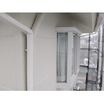 玄関上の破風板など面積が大きめでかなり目立った汚れがあり、全体的にぼんやりとしたイメージを受けます。雨樋も色がくすんで見えるのが施工後と比較することで初めて分かります。