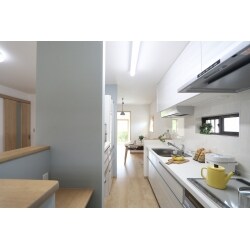 壁付けのキッチンをご希望でしたので、振り返るとすぐに収納スペースがくるように配置しました。ただ、クローズドキッチンにしてしまうとLDKの一体感が無くなってしまうので、間仕切り壁を天井までにせずに少し開けることで繋がりを感じていただけるようにご提案しました。