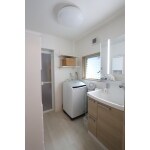洗濯機と洗面化粧台の位置を変えることで帰宅後まっすぐに洗面化粧台に向かえるようにご提案。さらに洗濯機周りも洗剤などが手の届くところにあれば便利なので、洗濯機上に可動棚を設置しました。