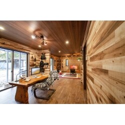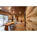 緑に囲まれているために、湿度の多い環境である上に床下は土間でしたので防湿シートと調湿材の施工を行い改善を図りました。基礎はしっかりしていましたので傷んでいた1階の床をバリアフリーに整えて作り直し、無垢の質感の有るフローリングでナチュラルで心地よい空間をつくっています。 天井や壁もはがして金物で補強を行い、断熱材を入れました。これで冬も過ごしやすくなり、冷暖房費も削減できます。普段過ごしている1階の使い勝手を考慮し、縁側を含めた広い和室とダイニング、居間を段差なくつなげて大きなLDKへと変えました。カヌーや釣り、キャンプなどアウトドアがお好きなのでログハウスや山小屋のイメージをもとに内装をご提案しました。クロスを使い分けながら。ペットの愛猫と愛犬にも過ごしやすい環境となるよう配慮しました。集めていたラグなどを効果的に使い趣味の道具を飾られた施主さま。100%自分の好きなものに囲まれたLDKとなりました。庭だけでなく時には家の中でもキャンプして楽しんでいるとのこと。道具の手入れなどをしながら充実のおうち時間を過ごされています。
