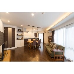キッチンを主役のLDKにするために床上げして設置し、キッチン廻りの収納はスライドドア付きの収納棚を用いて隠す収納に。スタイリッシュなキッチンとしました。 リビングはシックなデザインを意識し、4mの間接照明を設置。やわらかな明かりで温かみのあるリビングにしました。