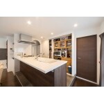 キッチンを主役のLDKにするために床上のキッチンし、キッチン廻りの収納はスライドドア付きの収納棚を用いることで物を隠しスタイリッシュなキッチンとしました。