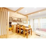 防音壁の隣には、もともとのリビングと和室を取り込んで設けた広いLDK。格子や対面カウンターで空間を仕切りながらも、コミュニケーションがとりやすい家族の為の空間になった。 浴室の窓は、浴槽に入りながら外の景色を眺められるようサッシを交換。 洗面所は変形スペースに合わせた造作洗面を設置。照明やタイルで温かみのある雰囲気を出した。 特殊な形をしているトイレの空間には、お客様が来た時にも自慢できる造作手洗い器を新設。