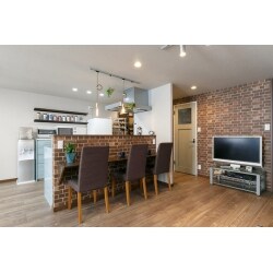 ・レンガクロスが生きるヴィンテージ空間。 ・存在感のある、マグネット伝言板作成。 ・部屋の中央にあるオープンキッチン。 ・斬新な4人家族のワンルームレイアウト。 ・造作パソコンデスク作成。