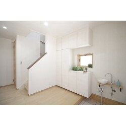 ホワイト一色の清潔感ある明るい洗面室に仕上げました。