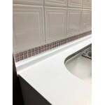 コンパクトながら、静音性能のあるステンレスシンクや節水できる「エコカチット水栓」、3つ口のコンロと機能性も十分にあることで人気のシリーズ「VーStyle」をご提案させていただきました。 収納ユニットのペイントウッド柄に、ブラックのハンドルをポイントにし、床はサンゲツ様のクッションフロアのストーン柄グレインタイルをお選びになったことで、明るくおしゃれなフレンチモダンなキッチンとなっております。 キッチンのタイルは、既存部分とキッチンユニットとのスキマに、現場施工担当者がモザイクタイルを組み合わせました。