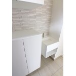 白を基調とした明るい玄関となりました。玄関を入って右手には土間スペースが続きます。 お洒落な手洗い器やエコカラットでスタイリッシュに仕上がっています。
