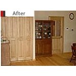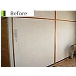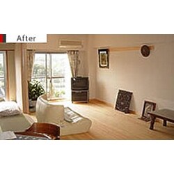 【工事内容】 ・間仕切り変更/建具入替/内装仕上げ一式 ≪仕上げ≫ ・内装(天井・壁・クロス) ・床:桧小節無垢材/天龍木材 ・建具:無垢調自然塗装仕上げ (施主様支給品) ・塗装:巾木・廻縁・見切りペンキ仕上げ 床自然塗装(現場仕上げ) 【コメント】 内装仕上げに大変こだわりを持っておられ、初回打ち合わせ時にはすでに、インターネットにて購入された建具がありました。建具に合わせて床材・クロス柄を選ぶのに苦労しましたが、仕上がりはお施主様大満足の出来映えとなり、一安心です。 間取りもDK+洋6をLDKに和室との取り合いの壁を3枚引戸として、明るく広々開放的な空間へとなりました。