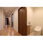 お父様の生活スペースとなる1階はすべてバリアフリー設計に。将来的に車椅子にも対応できるように廊下の幅を通常より広く確保しています。 居室から水まわりまでの利便性を重視して、居室の隣にトイレを配置。廊下には足元灯を設置して夜間や非常時の安全性も確保しました。 また、廊下の壁面全面を補強をしてあるので、将来手すりが必要になった際は、どこにでも設置できるようにしてあります。