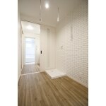 ホテルライクなブラケット照明がオシャレな洗面化粧室です。 広々としたランドリールームも備えており、そちらにはホスクリーンを設置。洗濯物を干さない場合は物干しざおを収納できるため、普段はスッキリとした状態で使用できます。