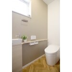 ベージュを基調とした、落ち着いた雰囲気のトイレスペースです。アクセントにヘリンボーン風のフロアタイルをチョイス。 シンプルで洗練された空間に仕上げました。