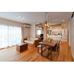 LDKの空気感。 無垢フローリングのような足ざわりのフローリング。 こだわりのペンダント。 木のぬくもりを大切にしたデザインに仕上げました。