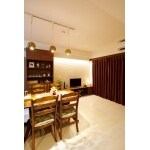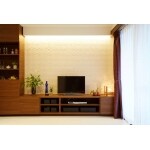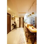水回りの間取り変更と和室の取り込みによってリビングが広く、開放的になりました。 常にリビングで過ごせるように、カウンタースペースも設けました。 空間をより演出するために、タイルをいたるところに使用しました。 一番メインとなるテレビの背面は、間接照明を埋め込んで、よりタイルの質感を強調しています。