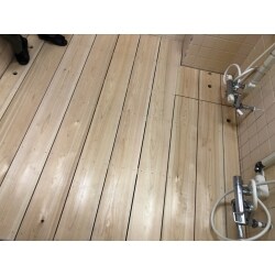 介護施設ということで、既存のすのこ巾より大きめに幅をとり、隙間を減らすことで介護しやすい安全性を考慮したすのこを作成しました。その分水はけが悪くなるので、水抜き穴を設けデメリットがなくなるよう工夫しました。
