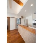 LDKの天井を吹き抜けにし、梁を見せた。長年家を支えてきた大木がLDKの象徴となっている。キッチンの上に仕込んだ間接照明が空間の雰囲気をさらに盛り上げる。