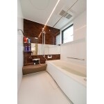 お家の雰囲気に合わせたパネル色が際立つ広々バスルーム