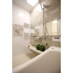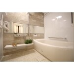 浴室をベージュ系の色合いでまとめることにより、ラグジュアリー感がアップ! ゆったりくつろげるバスルームです。 ワイドミラーをチョイスすることでさらに高級感アップ!