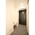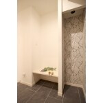 玄関を入って左手にウォークインクローゼットを設置。そこを進むと、洗面室まで抜けることができます。 靴を脱いで上着を掛け、他の部分を触ることなく手洗い可能。 衛生対策もバッチリです! 玄関右手には荷物を置いたり、ブーツなどを履く際に便利なベンチを設置。 その隣には、大きなスポーツ用品などを置くこともできるスペースを作成。このように、ちょっとしたスペースに遊び心のなるクロスをチョイスすることでとてもオシャレな雰囲気になります。