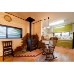 この建物の見どころは、薪ストーブ、ロフト、天窓、ウッドワンのドア、そしてトイレと洗面が一体のサニタリー。 日本でサニタリールームを採用する方は少ないのではないでしょうか。 広い庭に面したウッドデッキ・ふぞろいのニッチ・キッチンの床のテラコッタタイル・ロフトの覗き窓はお子様が喜び、身近に家族がいることを感じられます。