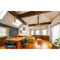 緑が生い茂る外とお家の中を繋げ、森をイメージしてインテリアコーディネートを行いました。 玄関を開ければ、パイン材を用いたヴィンテージグリーンのフローリングと イエローの鳥をあしらった輸入クロスが目に飛び込み、 まるで鳥のさえずりが聞こえてきそうな森へと誘います。 既存の梁と腰壁を活かしたリビングダイニングには、寄木細工が美しいパーケットフロアを張り、 落ち着きのあるクラシカルなコテージハウスのよう。 ゆったりと時の流れる素敵なお住まいへと生まれ変わりました。