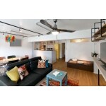 とても見晴らしのいい高層階にあるご自宅。 「一番明るい場所へ広いリビングを設ける」ことを起点に、他は間仕切りを最小限に抑えてシンプルに計画しました。 構造壁による間取りの制限は築古マンション特有のものですが、 それらを活かしつつ、収納を分散させながら回遊同線を設け、無駄なスペースを作らないよう意識しています。 天井壁はめいっぱい確保するために、あえて電気配管をすべて露出型の鋼管にすることで、 インテリア性と住まい勝手を両立する提案をしました。