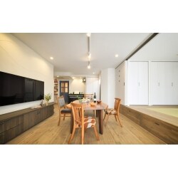 66平方メートルの1LDKからそれぞれのプライベートスペースと収納スペースが欲しいとのご要望にお応えするべく、 デザイナーが提案したのは「高さを利用したプランニング」です。 お子さまふたりの個室は、ベッドスペースをまるで二段ベッドのように上下で仕切り、間仕切り壁にオリジナルの回転窓をつけました。 光と風を程よく通し、プライバシーを邪魔しません。 奥さまの趣味コーナーには、娘さまの部屋側にある間仕切り壁に上げ下げ窓を造作。 仲良しの母娘で会話が楽しめるように設計しました。 また、リビングダイニングの一部には小上がりを造作。ご夫婦の寝室を兼ねているため、引戸で仕切れるようにしてあります。 小上がりの下にはたっぷりの収納スペースを確保して、ご家族の要望を満たす暮らしやすい住まいとなりました。