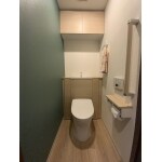 トイレはレストパルへリフォーム。タンク上の手洗器で限られた空間を有効利用しているので見た目がスッキリとしました。今までなかった手すりも取り付け、末永く安心してお使いいただけます。 ペカン柄のクッションフロアにくすみカラーのグリーンのアクセントクロスがナチュラルなトイレ空間を演出しています。