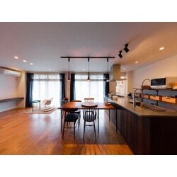 ・鉄骨造の構造を生かし南に大空間のLDKを配置し、キッチンは動線の良いアイランドスタイルとした ・PCルームやクローゼットなど家族が欲しい部屋をリビングから繋げて配置し扉を設けずワンルーム空間とした ・DIYで手が加えられるようオープンタイプの食器棚とした ・しっくいや木、石の質感などを取入れたインテリアをご提案した