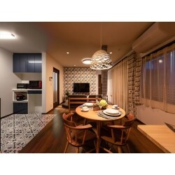 シンプルな生活がしたい。というお言葉をいただいておりましたので、和室二間と両端にありました縁側を生活空間に取り込むことで、外の緑がより感じられ、風が流れる空間を計画しました。そして窓に関しても防犯に備え、掃出しの大きな窓から腰窓ペアガラスに取替、防犯格子を取り入れました。 愛犬との生活という事で、玄関とリビングに愛犬のエリアを作りました。青色がお好き!という事で、北欧のイメージを取り込み、青色が寒々しく感じられないように、四季を通して青を感じられる配色を心掛けました。ダイニングでの時間が長いという事で、昼白色から電球色が変えられる照明器具も存在感があります。