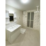 洗面脱衣室には南側に室内干しができるランドリースペースを新設。 真っ白な洗面化粧台にアクセントのアンティーク調のフラワー柄の壁紙がお洒落な洗面室になりました。