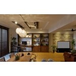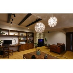 強いご要望だったリビングは、和室をリビングと繋げ、廊下の一部を取り込むことにより充分な広さを確保しました。 さらに化粧梁やシーリングファンといったアイテムを取り入れて、長所だった天井高を強調。 「アレルギーなどが気になっていたので」と自然素材の効果に興味がおありだったため、 無垢材や珪藻土をたっぷりと使用し快適さもアップ。開放感のある心地のよい空間となりました。 完成したお住まいは、珪藻土のホワイト×無垢材のブラウンでまとめたシックで落ち着いた佇まい。 そこにマテリアルを加え、ワンランク上のリゾート感のただよう空間へと仕上げました。 ポイントは「重厚感・存在感のある素材」です。 リビングの1面に施工された天然石のタイルや、ハードなレザーのアイテム。 ダウンライトといった間接照明もうまく使うことにより、非日常感が生まれました。