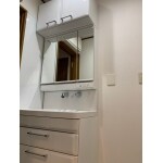 洗面台下に造作をして洗面台の高さを上げつつ、ショートミラータイプの鏡で吊戸棚を現状の高さを維持できるよう工夫した。洗面横に壁パネルを設置し、水がはねてもお手入れしやすく、衛生的にも問題ないように工夫した。 クロスやクッションフロアに防カビのものを採用することでカビの生えにくい空間になるよう工夫した