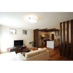 リビングの無垢フローリング、ゆったりとしたLDK空間、リビングからのウッドデッキ、見せ梁と見せ柱で空間にアクセントをいれました。 奥様の大好きなちょっと濃い色が入ったナチュラル空間、水廻りの動線もすっきりし、使いやすい住みやすい家になりました。