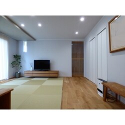 オークの無垢床材は乱尺仕様を採用。 実際に床材の長さが異なるものを現場で選びながら貼り合わせていくため、大変手間がかかりますが見た瞬間から自然素材の質感が伝わります。 くつろぎの空間であるタタミスペースは、 お孫さんが来て遊ぶことも多いので、 お手入れ性のあるタタミ仕様としました。