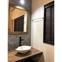 ダークブラウンのウッドブラインドやブラックアイアンバー、古材フレームミラーなどの無骨なアイテムでブルックリンスタイルを表現。