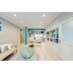 残しておきたいとご要望のあった飾り棚。 扉を白に塗装、取手をスタイリッシュな物に 取替。壁面はブルーの壁紙を貼りました!